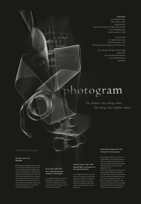 A poster designed to show the history of photograms in 20th century. Images are first made in the darkroom as actual photograms and then layered in Photoshop.